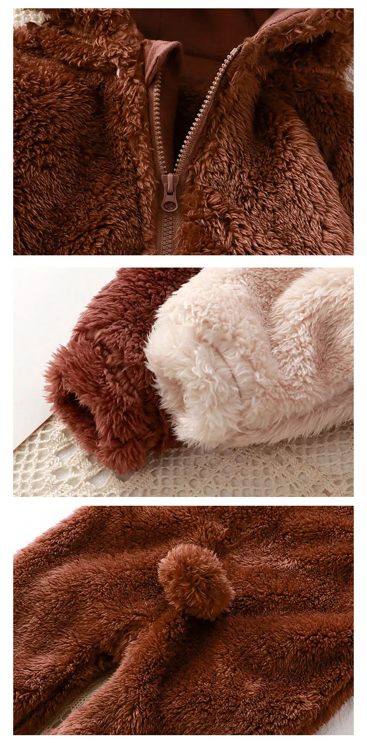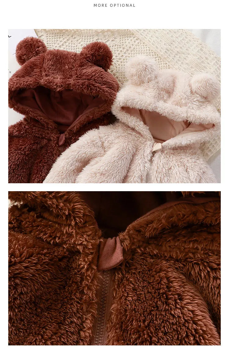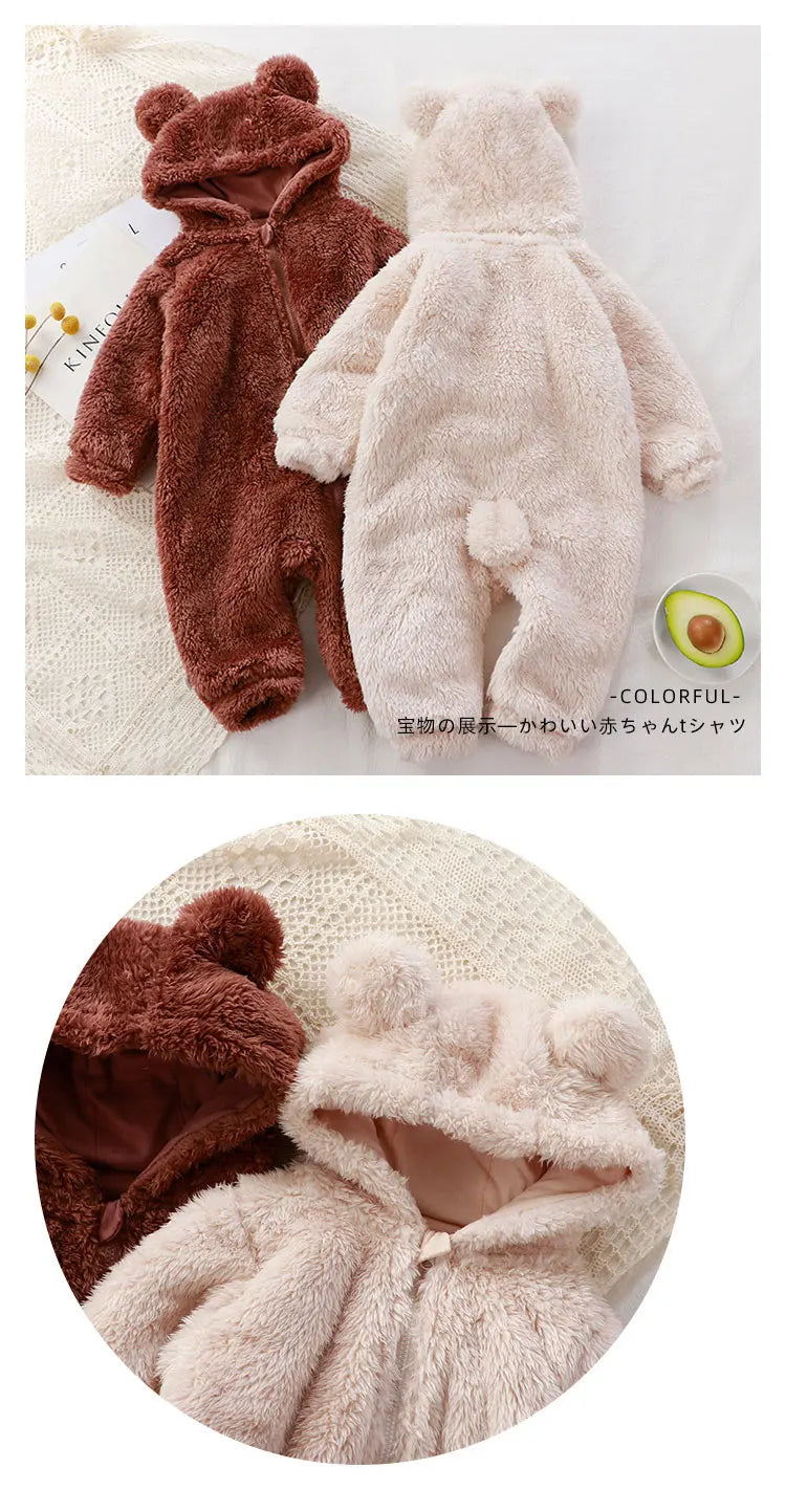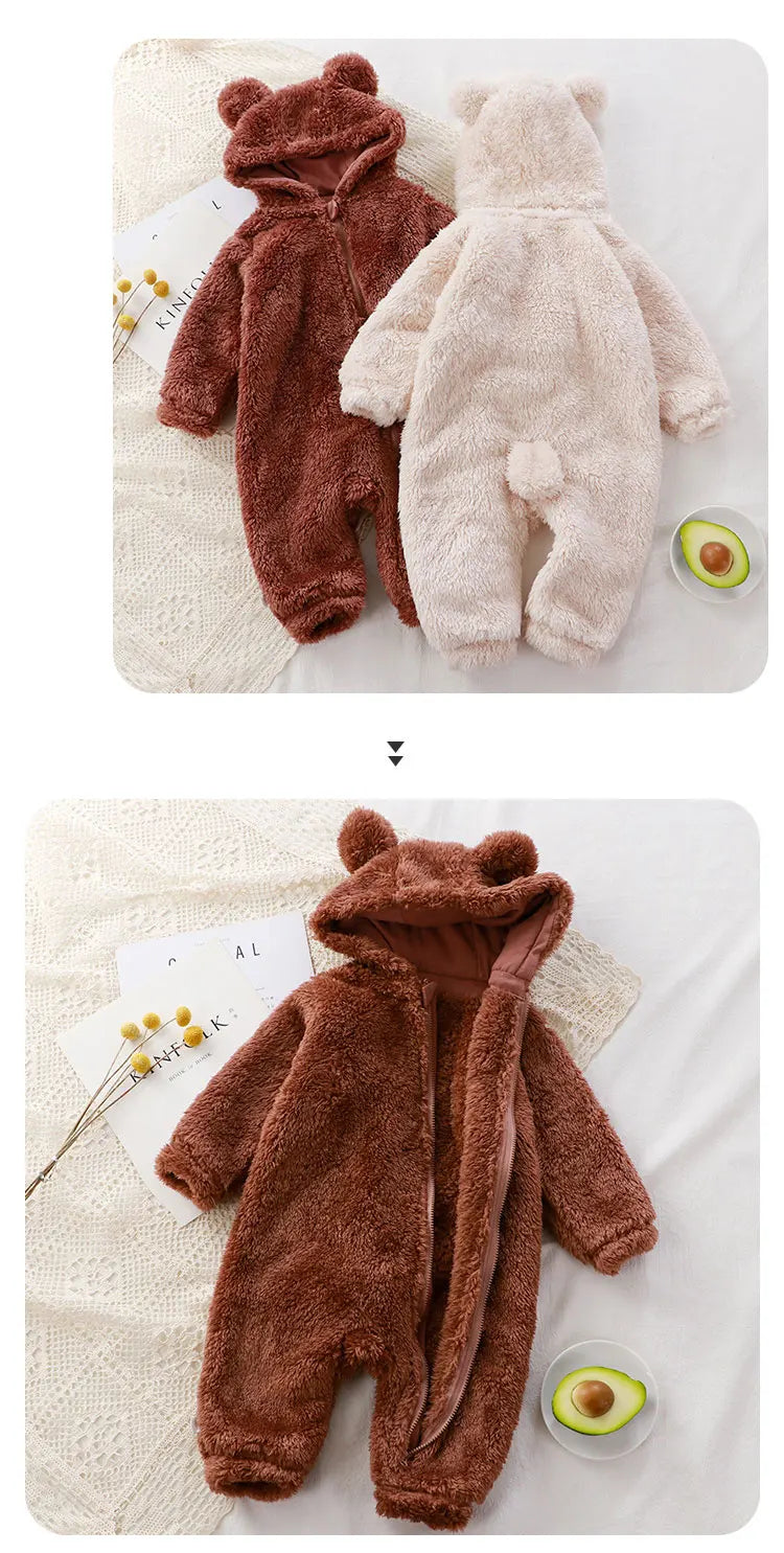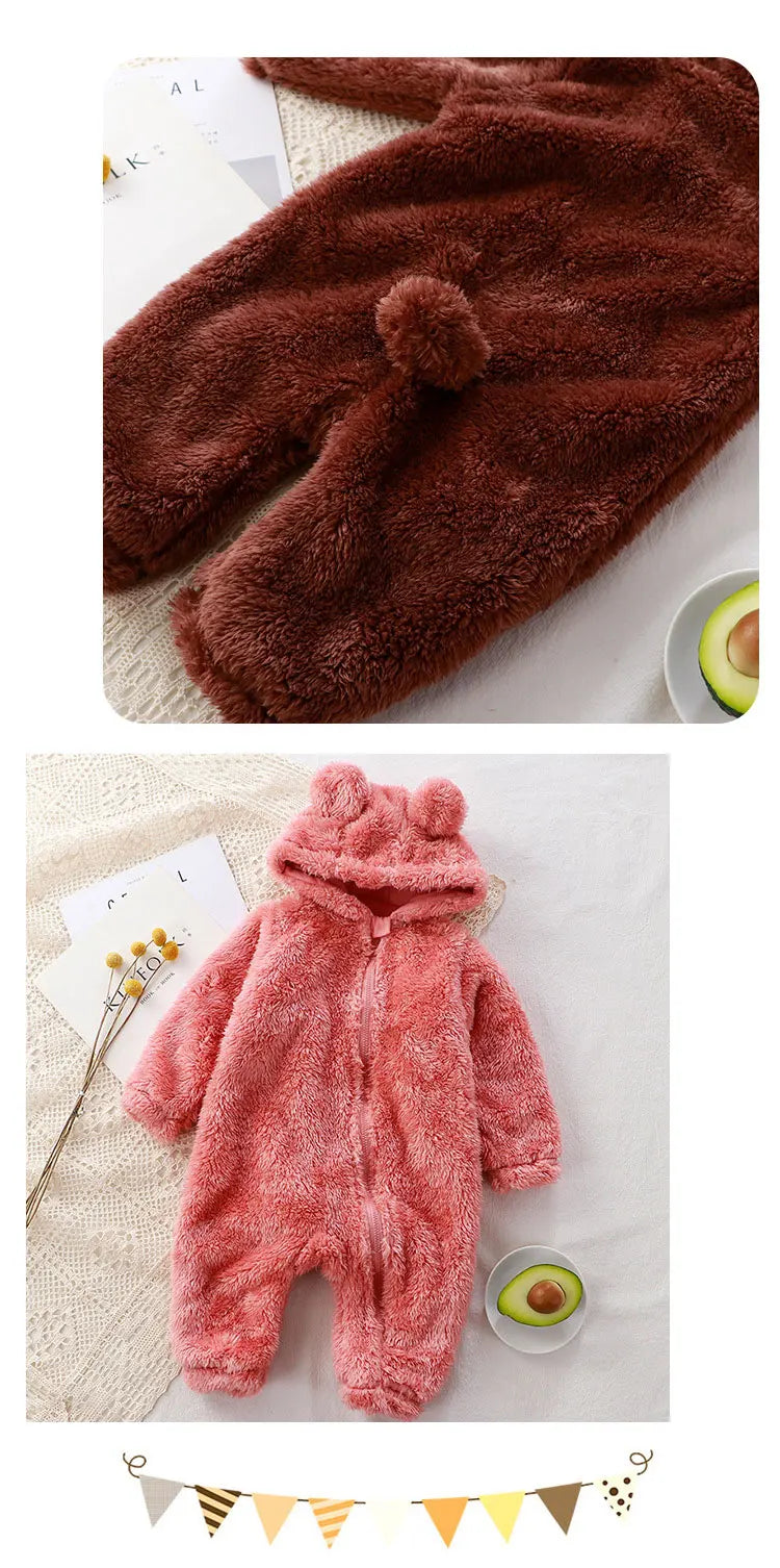 Thick Warm Baby Rompers Cute Winter Infant Jumpsuits Hooded Coral Fleece Bear Shape Newborn Soft Pajamas Overalls Clothing