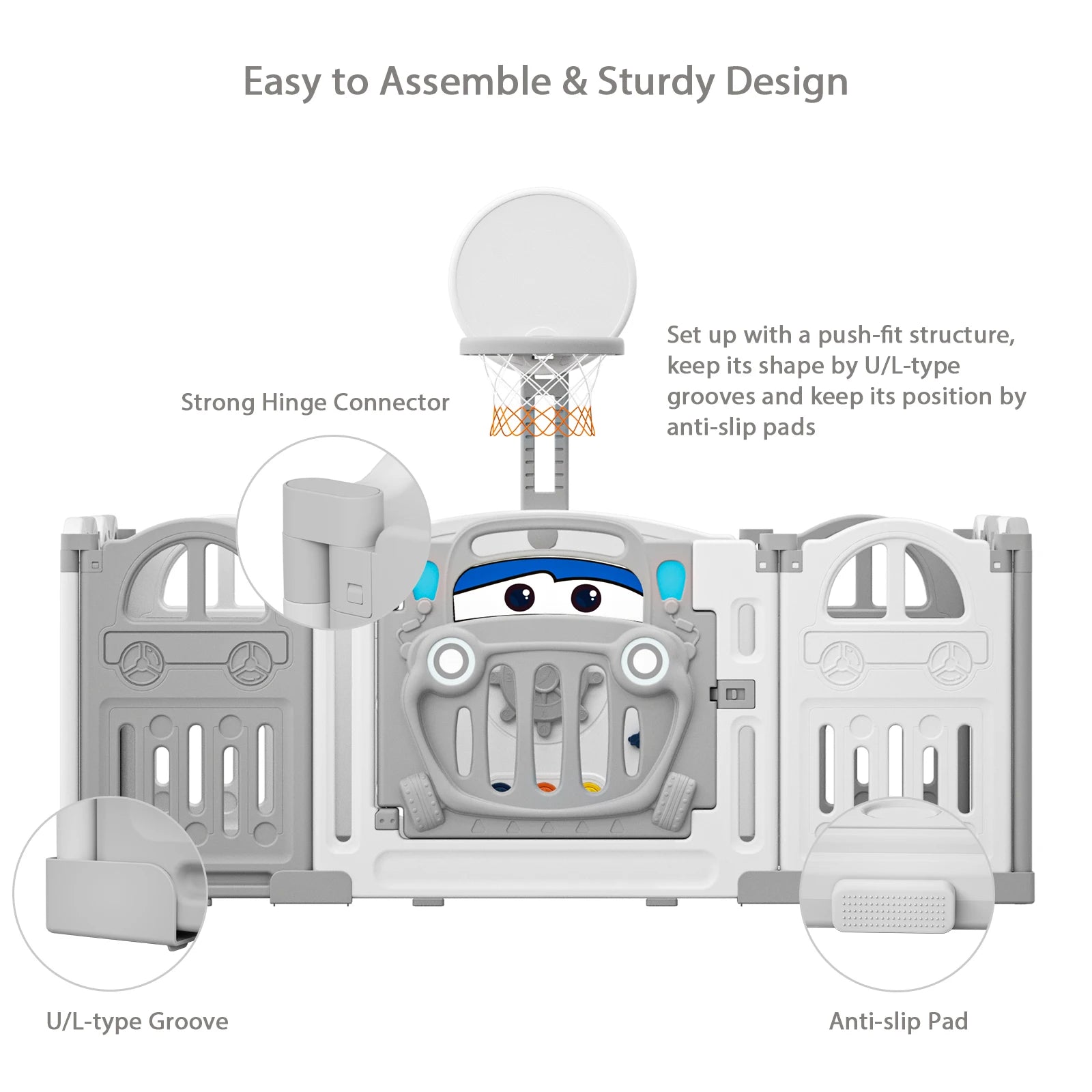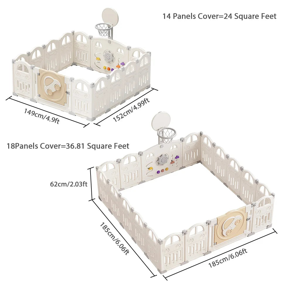 Foldable Baby Playpen with Basketball Hoop & 50Pcs Coloured Pit Balls without Play Mat, Toddler and Baby Playpen fence, 14-Panel Features: